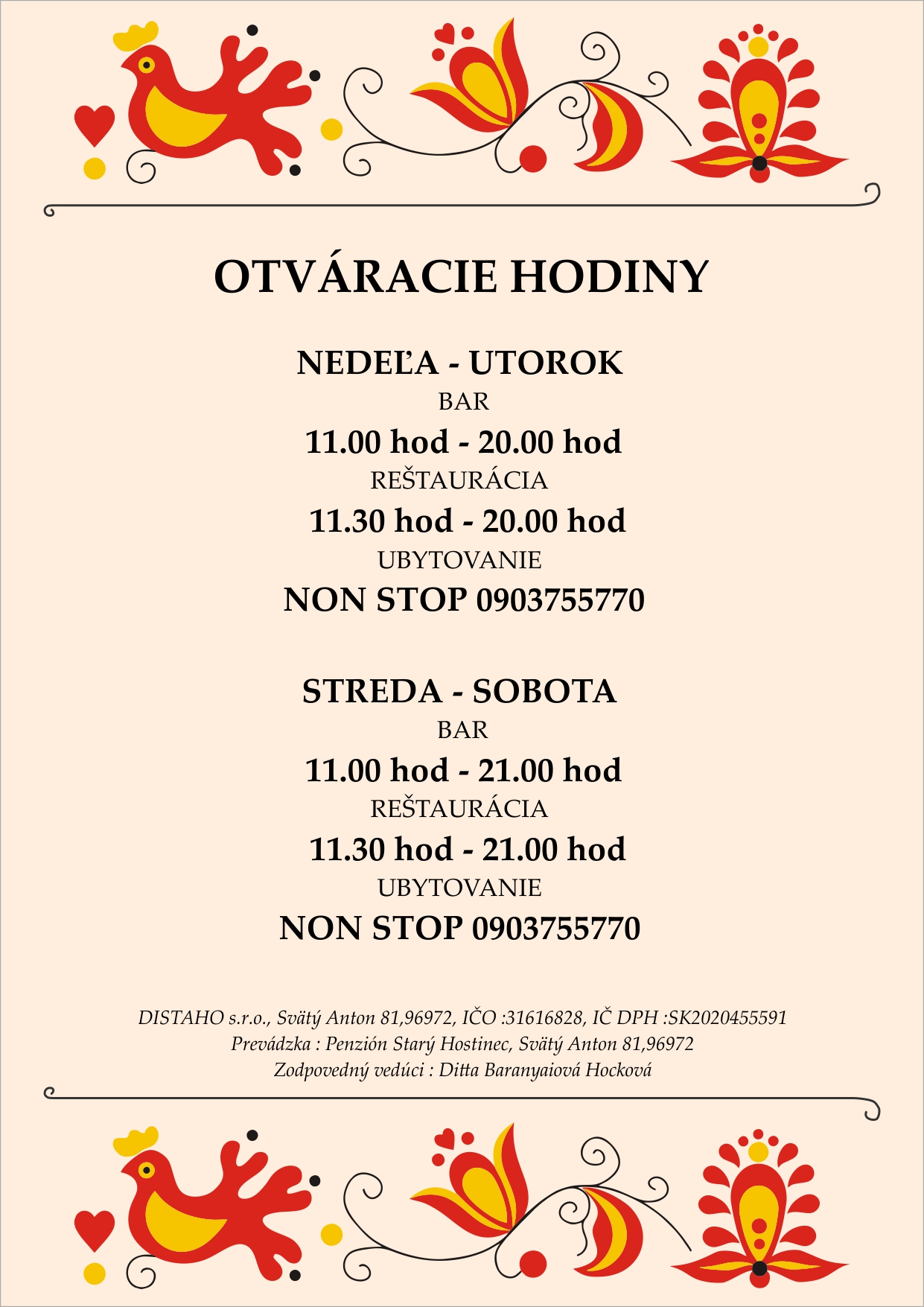 Marián Š., GoogleVeľmi príjemné a útulné prostredie, úžasný personál a vynikajúce jedlo! Všetko domáce, použité ingrediencie naozaj kvalitné. Mali sme tu svadbu, všetci hostia si pochvaľovali jedlo a zjedlo sa takmer všetko do posledného zrnka ryže. Ubytovanie voňavé a čisté, autentickosť celého penziónu s ľudovou nôtou je očarujúca. Vrelo odporúčam!