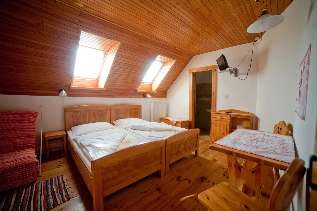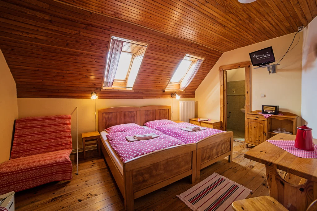 Atmosféra: Malá, útulná izba s prvkami liptovského kraja. Večer stačí zhasnúť a cez strešné okná pozorovať hviezdy. Na dedine svietia inak. Pokojnejšie, bližšie, úprimnejšie.