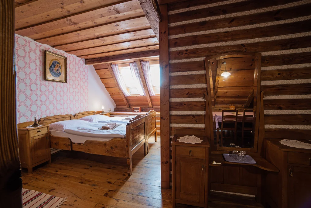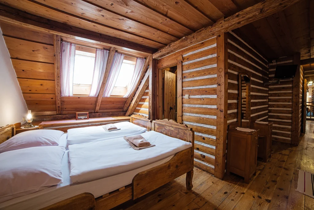 Atmosféra: Toto je izba, ktorú si rodiny zamilujú pre priestor, ale aj pre jedinečný detail: 200-ročné postele z regiónu Hont, v ktorom sa práve nachádzate. Každé lôžko je samostatné, pričom dve tvoria manželskú posteľ – tradičné, pevné, s príbehom.