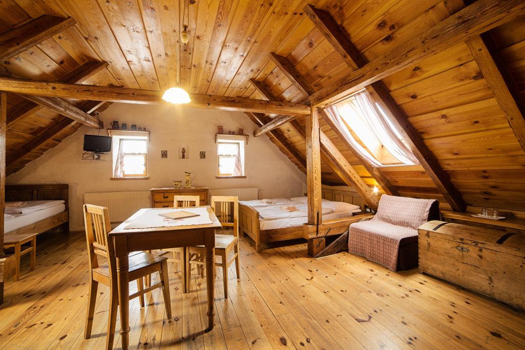Atmosféra: Priestranná rodinná izba v samostatnej časti penziónu. Samostatný vchod a malý dvor vytvárajú pocit súkromia. Akoby ste prišli na chalupu, len bez staorstí. Ideálne, keď chcete mať deti na dohľad, pokoj a vlastný rytmus dňa.