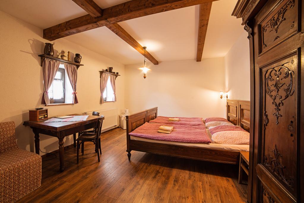 Atmosféra: Podkrovie novej časti so samostatným vchodom. Výhľad je plný zelene a potok, ktorý tečie popri penzióne, je tu počuť najkrajšie. Stačí sa započúvať. Ideálna izba pre dvojice, ktoré chcú pokoj.