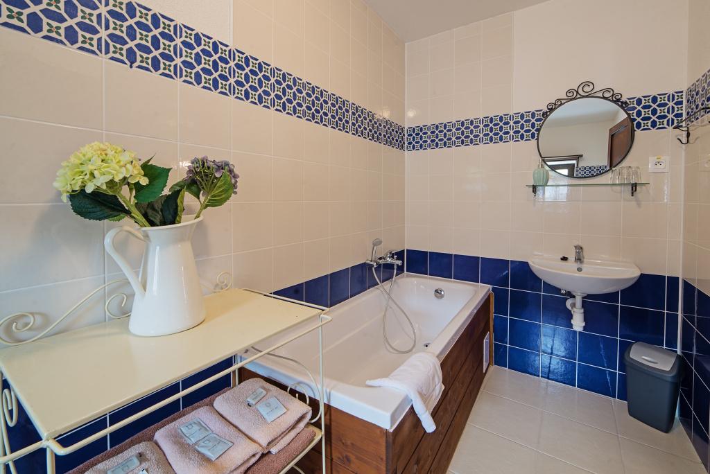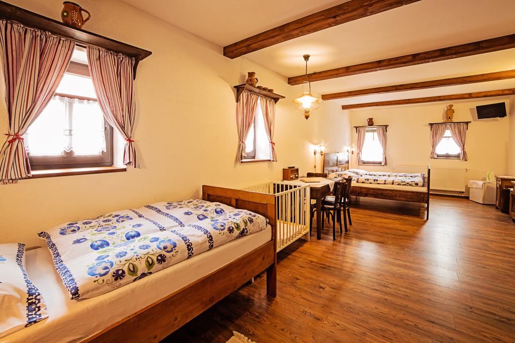 Atmosféra: Priestranná rodinná izba s pokojnou atmosférou v podkroví novej časti. Veľkým plusom je kúpeľňa s vaňou a možnosť prístelky. Ideálne, keď chcete viac miesta a komfort.